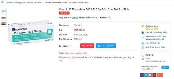 Bạn cũng có thể dễ dàng chọn mua Vitamin D Fluoretten 500 I.E tại gian hàng của các sàn thương mại điện tử hoặc chọn địa chỉ bán dược phẩm uy tín để mua. Gian hàng của Dailyvita.vn sẽ là điểm mua hàng tốt nhất với giá thành rẻ, sản phẩm chính hãng dành cho bạn.