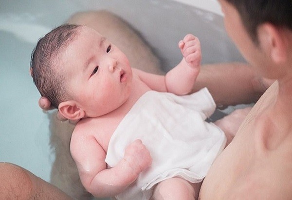 Khi trẻ sơ sinh đã rụng rốn, mẹ có thể thả bé vào chậu nước để tắm