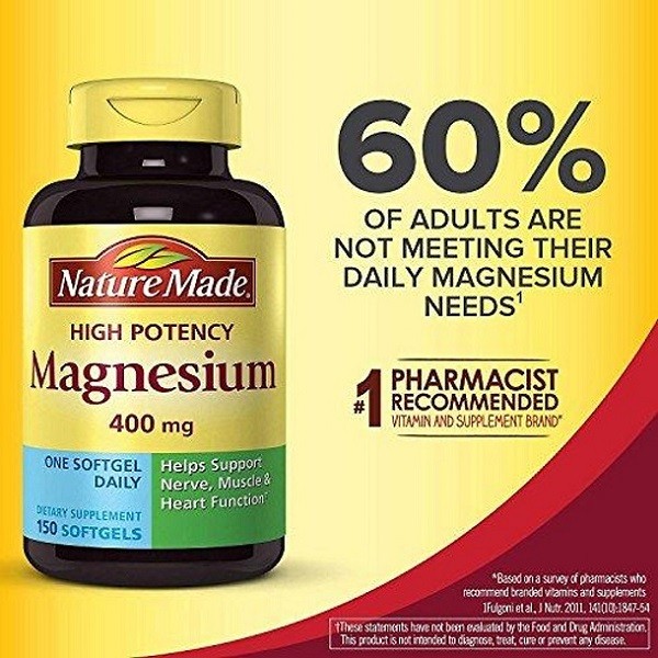 Magnesium Nature Made 400mg bổ sung Magie giúp hỗ trợ hoạt động chức năng của hệ thần kinh, tim và cơ bắp. Sử dụng Nature Made Magnesium 400mg một cách khoa học còn giúp hỗ trợ xương và răng phát triển một cách chắc chắn, khỏe mạnh. Hơn nữa, magnesium là một dưỡng chất đóng vai trò quan trọng trong việc chuyển hóa dinh dưỡng thành năng lượng.