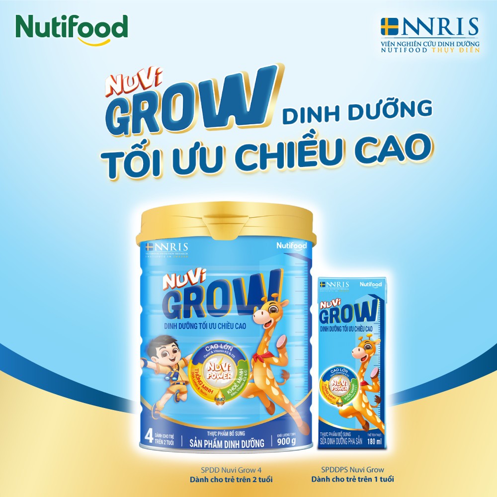 Nuvi Grow là một nhãn sữa tăng chiều cao cho bé được sản xuất bởi công ty Nutifood với hơn 20 năm thấu hiểu thể trạng và nhu cầu dinh dưỡng đặc thù của trẻ em Việt, kết hợp cùng các chuyên gia hàng đầu Châu Âu tại Viện nghiên cứu dinh dưỡng Nutifood Thụy Điển - NNRIS với công thức Nuvi Power dành riêng cho trẻ em Việt Nam, giúp kích hoạt và tối ưu chiều cao của trẻ.