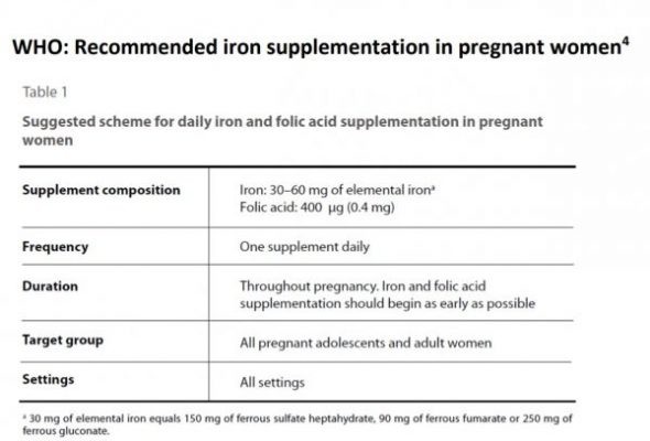 Theo khuyến cáo của Tổ chức Y tế thế giới WHO, phụ nữ lần đầu tiên phát hiện có thai nên uống ngay viên sắt mỗi ngày, uống kéo dài tới sau khi sinh một tháng. Liều bổ sung là 60mg sắt nguyên tố kèm theo acid folic 0,4mg mỗi ngày. Ngoài ra cũng nên sử dụng các thực phẩm có tăng cường sắt, acid folic cho phụ nữ mang thai.